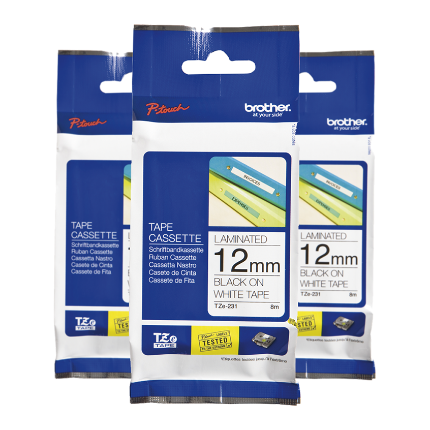 Fitas para Rotuladoras Eletrônicas, 12mm x 8mm, Branco, Escrita Preto, com 3 unidades, Tze231 - Brother - Copysupply | B2B