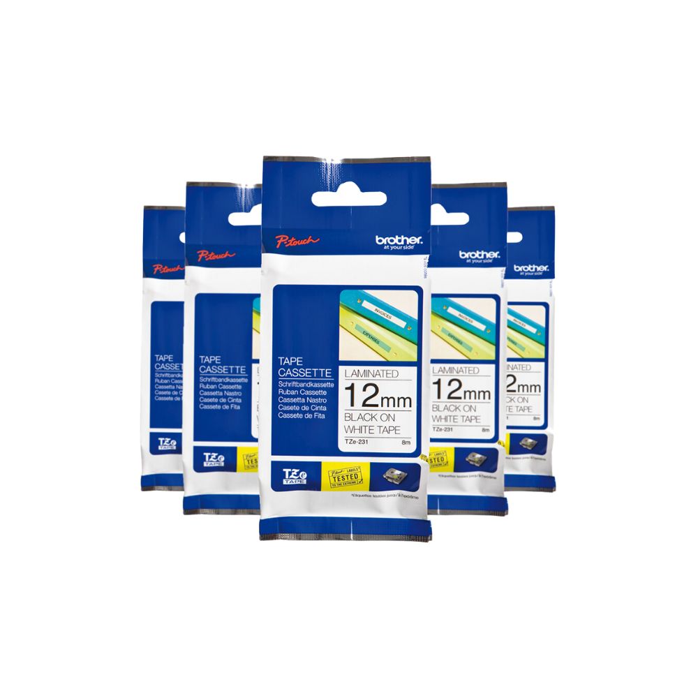 Kit com 5 Fitas para Rotulador Brother TZe-231, 12mm x 8m, Branco com Escrita Preta